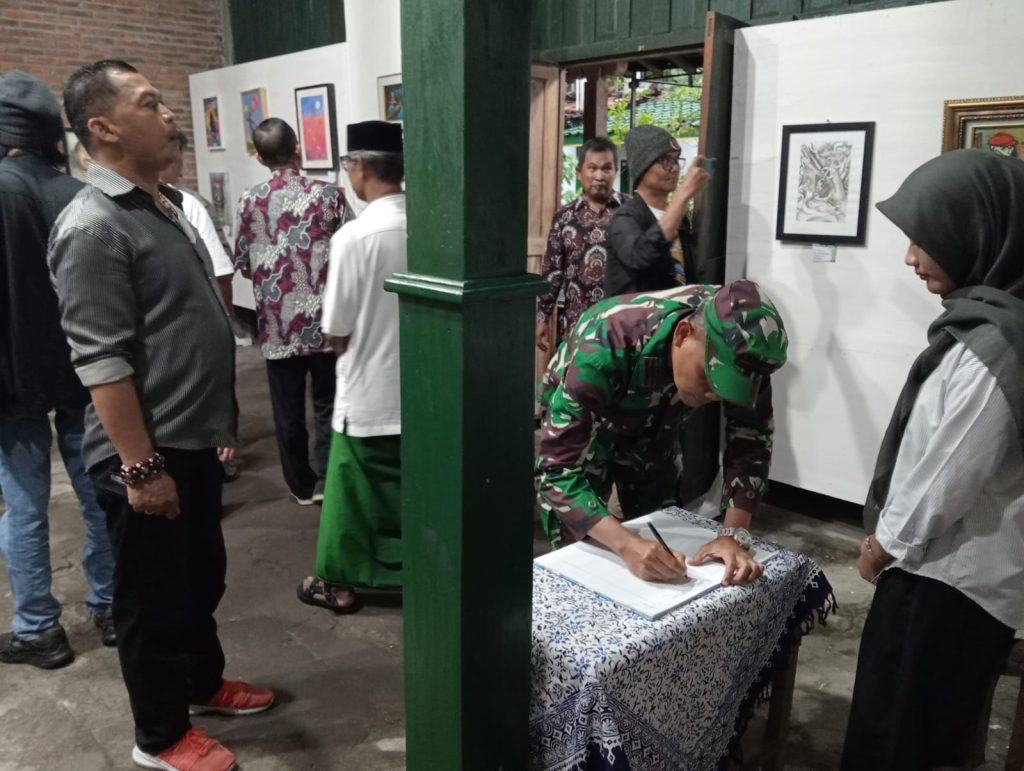 Bantul – Danramil 16/Pandak Kapten Cba Supriyono bersama Babinsa Gilangharjo Sertu Joni Siswanto dan Serda Mulyono menghadiri pembukaan pameran seni rupa bertajuk “Kembali ke Habitat” karya Tri Wiyono bertempat di Omah DhogK Art, Dukuh Karangasem, Kalurahan Gilangharjo, Kapanewon Pandak, Bantul. Minggu, (18/01/2026).