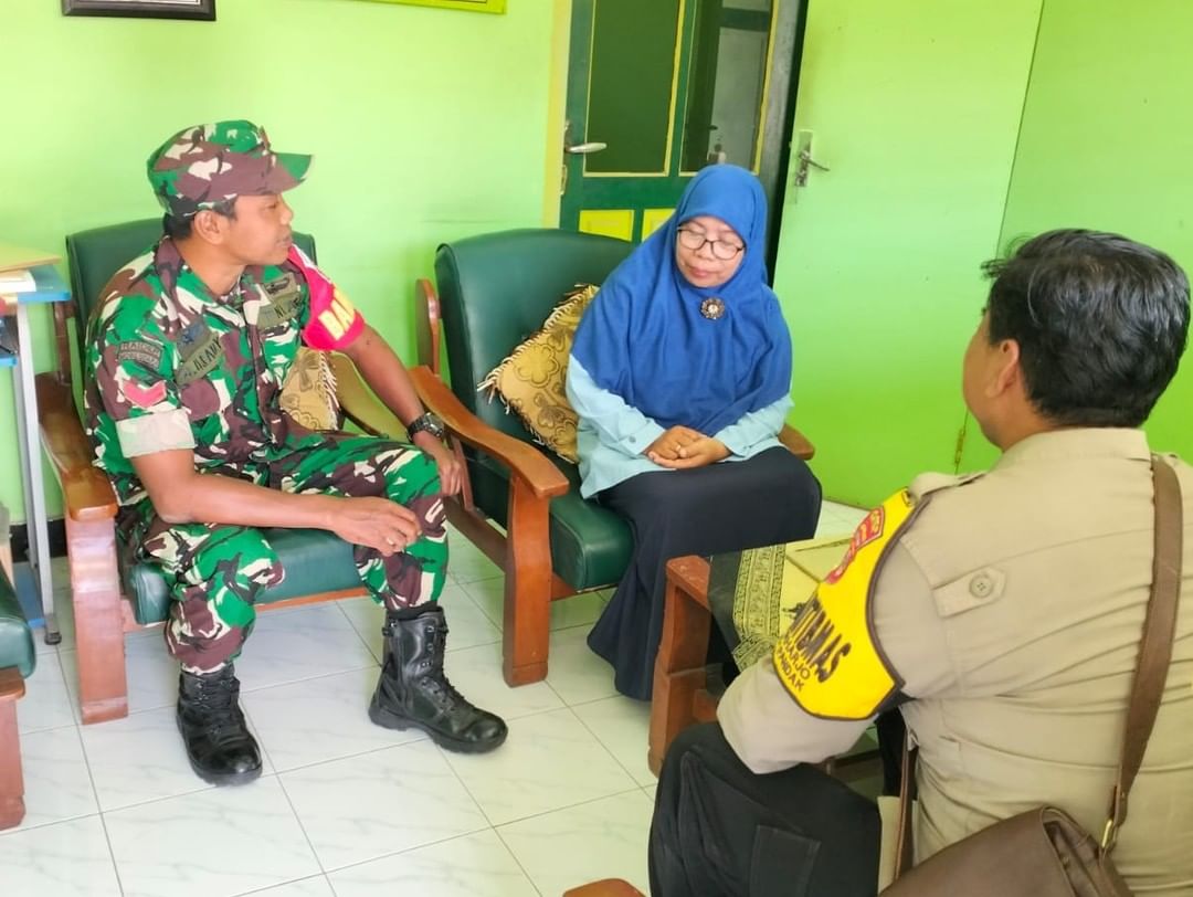 Pandak_Menyikapi dan menindak lanjuti maraknya kenakalan remaja, seperti perkelahian sesama sekolah, tawuran antar sekolah, pembullyan, Babinsa Koramil 16/Pandak, Kodim 0729/Bantul, Koptu Ari Usman bersama Bhabinkamtibmas melaksanakan patroli ke sekolah sekolah, patroli kali ini bertempat di SMP N 2 Pandak, Selasa 4 April 2023.