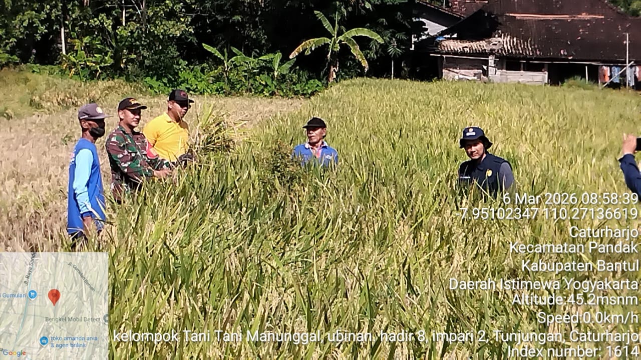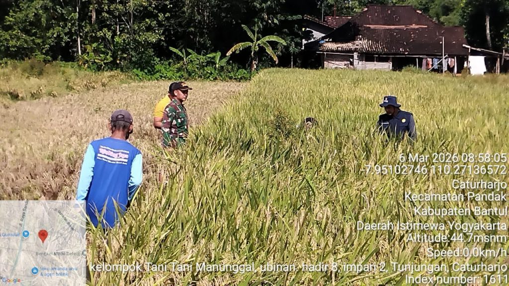 Bantul – Babinsa Caturharjo Koramil 16/Pandak Serma Tri Wahyudianto melaksanakan monitoring kegiatan ubinan padi di Kelompok Tani Tani Manunggal yang bertempat di Dusun Tunjungan, Kalurahan Caturharjo, Kapanewon Pandak, Kabupaten Bantul, Kegiatan ini dilakukan sebagai bagian dari pendampingan kepada petani dalam mengetahui potensi hasil panen padi di wilayah tersebut. Jumat (6/3/2026).