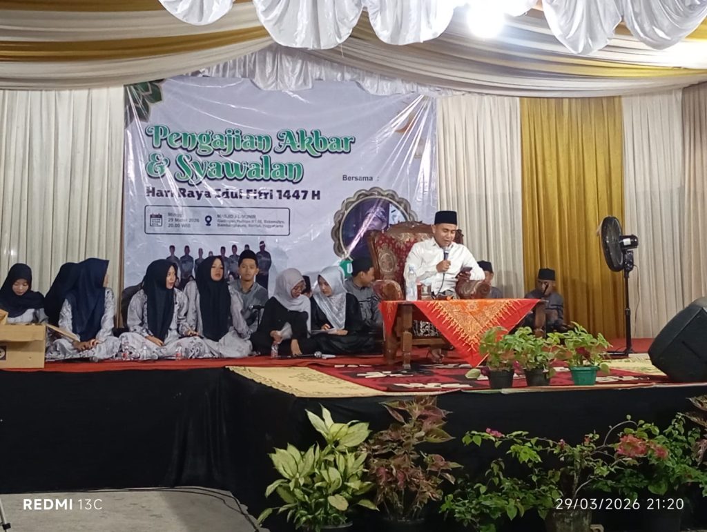 Bnatul – Babinsa Kalurahan Sidomulyo koramil 14/Bambanglipuro menghadiri undangan Pengajian Akbar dan Syawalan Idul Fitri 1447 H yang dilaksanakan di Halaman Masjid Al Munir, Pedukuhan Palihan RT 05, Sidomulyo, Bambanglipuro. Kegiatan tersebut menghadirkan penceramah Ustadz Miftahul Khoir (Miko Cak Coy) dan diikuti sekitar ratusan jamaah.Minggu, (29/03/2026).