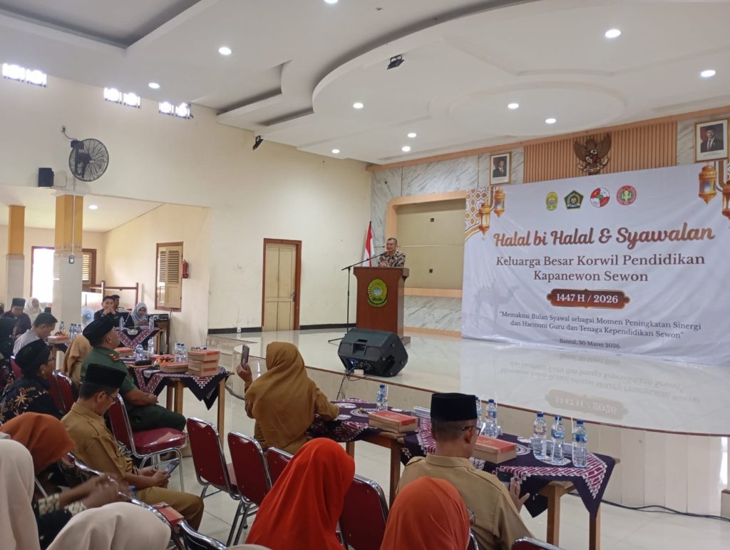Bantul – Komandan Koramil 04/Sewon Mayor Cke Yudhi Setiawan menghadiri kegiatan Halal Bihalal dan Syawalan keluarga besar Korwil Pendidikan Kapanewon Sewon tahun 1447 H/2026 M yang dilaksanakan di Gedung Manggolo Manis, Kalurahan Pendowoharjo, Sewon, Bantul, Kegiatan tersebut dihadiri oleh Kepala Dinas Dikpora Bantul, unsur Forkopimkap Sewon, kepala KUA, kepala puskesmas, para kepala sekolah, lurah, guru, serta tenaga kependidikan se-Kapanewon Sewon.Senin, (30/3/2026).