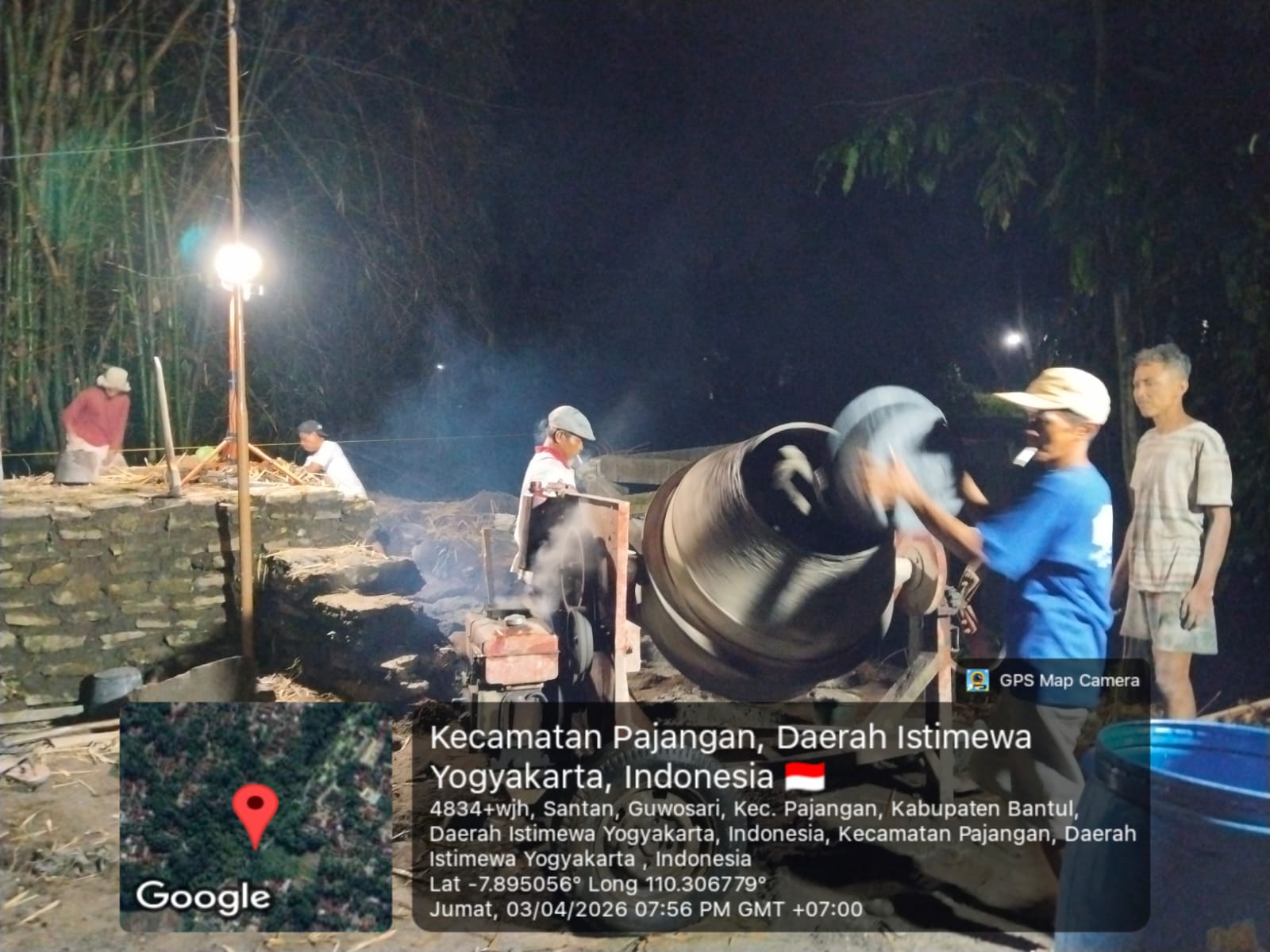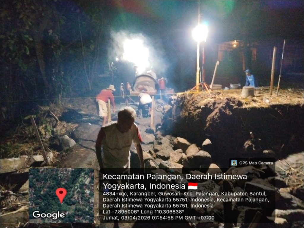 Bantul – Babinsa Kalurahan Guwosari Sertu Hendrawan melaksanakan kegiatan pembangunan Jembatan Garuda yang berlokasi di Dusun Santan RT 04. Kegiatan pada malam hari ini difokuskan pada lembur pemasangan pondasi tiang baja sebagai bagian penting dalam memperkuat struktur dasar jembatan.Jumat, (3/4/2026).