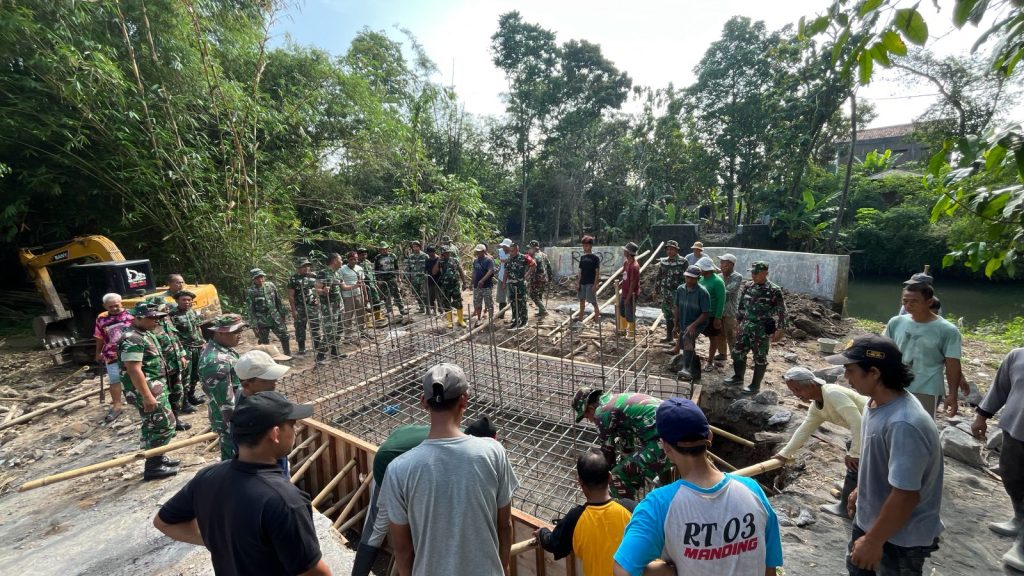 Bantul – Babinsa Kalurahan Trirenggo melaksanakan kegiatan pengecoran footplate pembangunan Jembatan Garuda di Dusun Manding RT 02, Trirenggo, Bantul. Kegiatan tersebut dihadiri oleh Danramil 01 Bantul Mayor Caj (K) Sri Mangestu, MA.A, Md, Pasiter Kodim 0729 Bantul Kapten Inf Sugeng, serta anggota Kodim 0729 Bantul dan Koramil jajaran. Minggu, (5/4/2026).