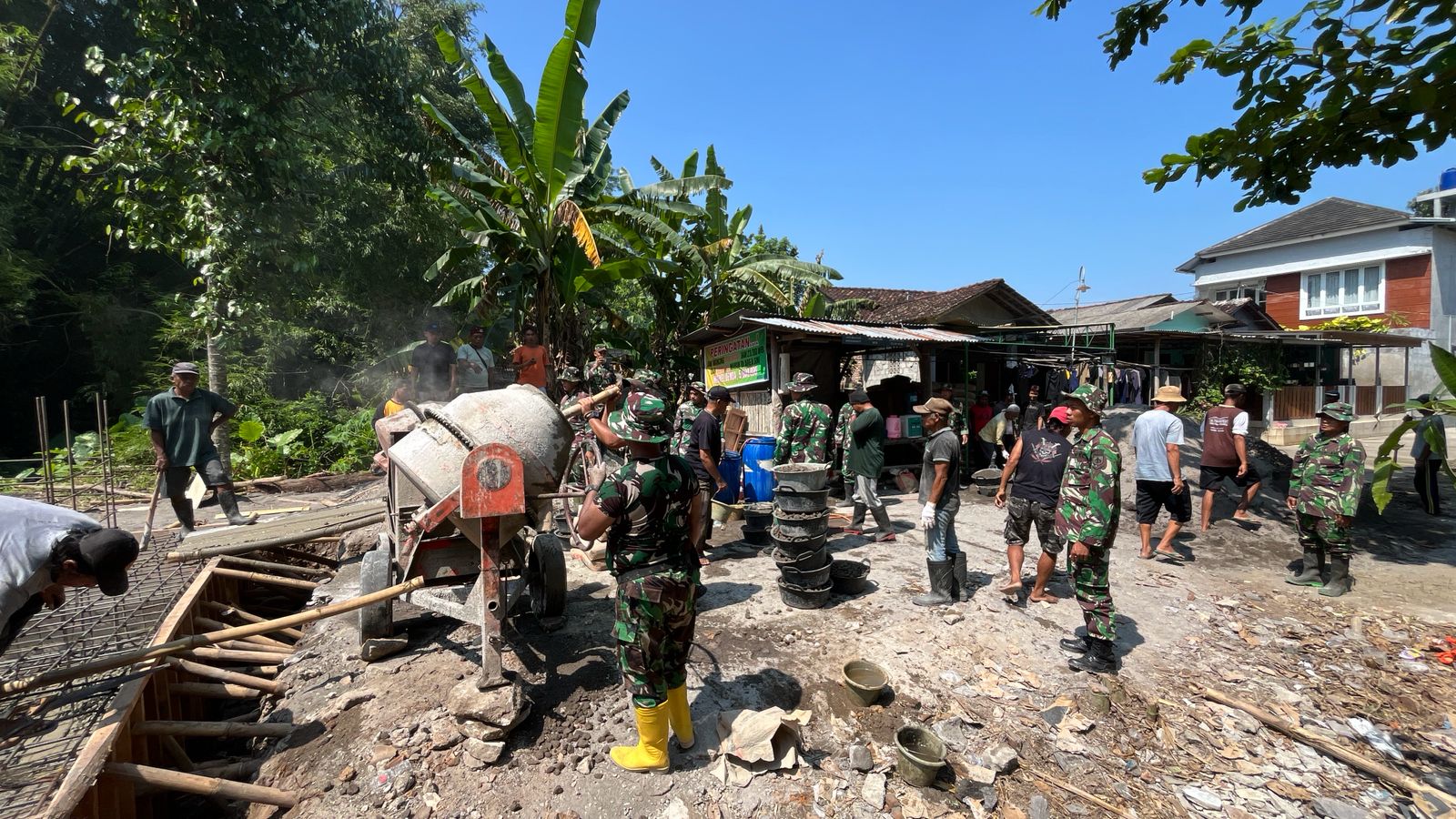 Selain itu, kegiatan juga melibatkan partisipasi aktif warga Dusun Manding yang bersama-sama anggota TNI melaksanakan proses pengecoran secara gotong royong. Kebersamaan antara TNI dan masyarakat terlihat dalam upaya percepatan pembangunan infrastruktur desa, sehingga diharapkan jembatan tersebut nantinya dapat memperlancar akses transportasi dan meningkatkan perekonomian warga setempat. Selama kegiatan berlangsung situasi berjalan aman, tertib, dan lancar serta penuh semangat kebersamaan.