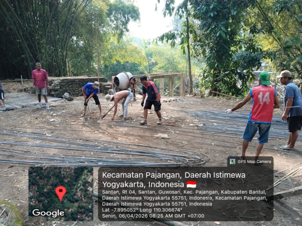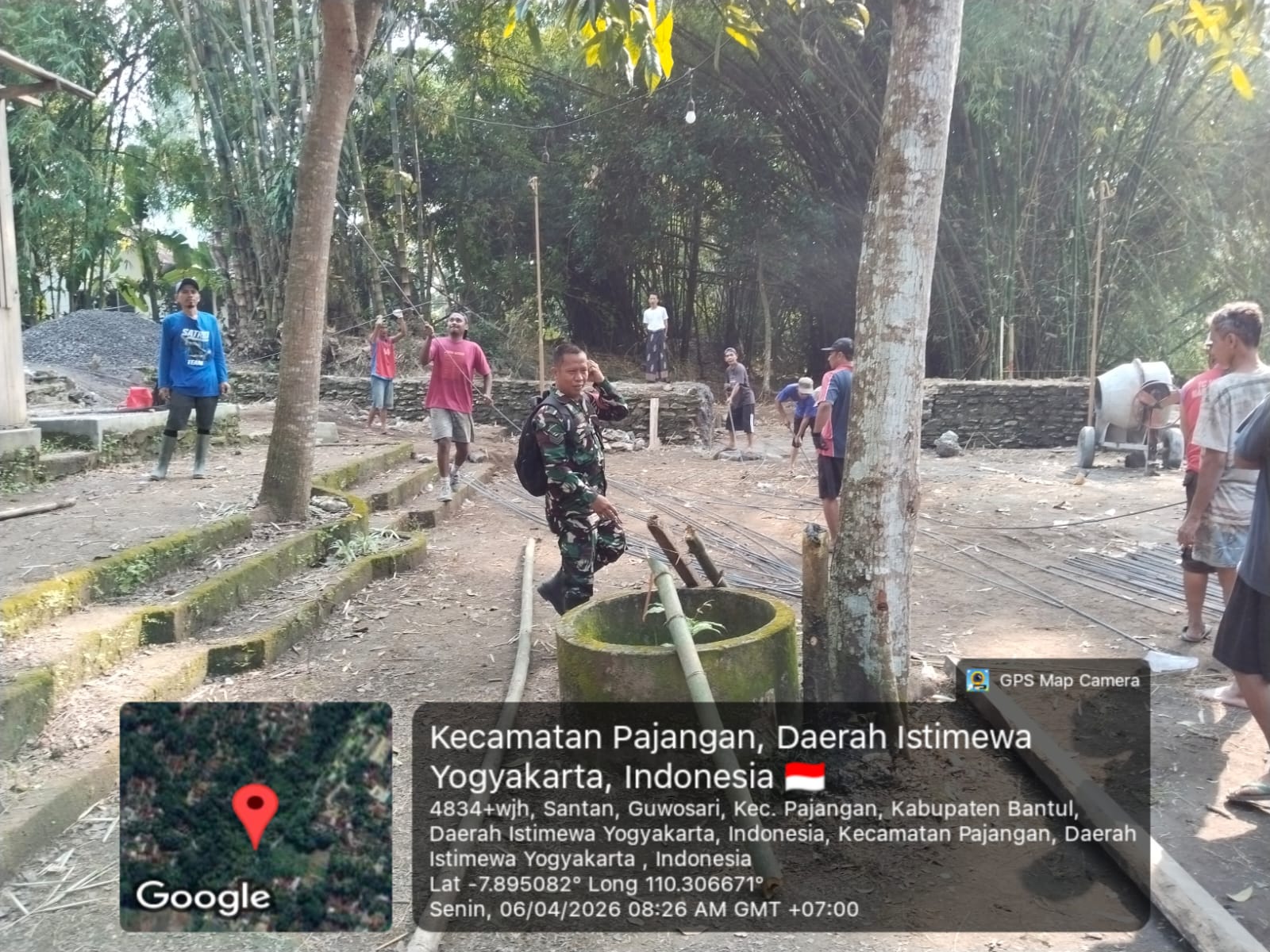 Bantul – Babinsa Kalurahan Guwosari Sertu Hendrawan bersama Kopka Sarwidi melaksanakan kegiatan pembangunan Jembatan Garuda di Dusun Santan RT 04 dengan melaksanakan perakitan kolom besi sebagai bagian dari struktur utama jembatan. Kegiatan ini merupakan tahapan penting untuk memperkuat konstruksi sebelum proses pembangunan selanjutnya.Senin, (6/4/2026).
