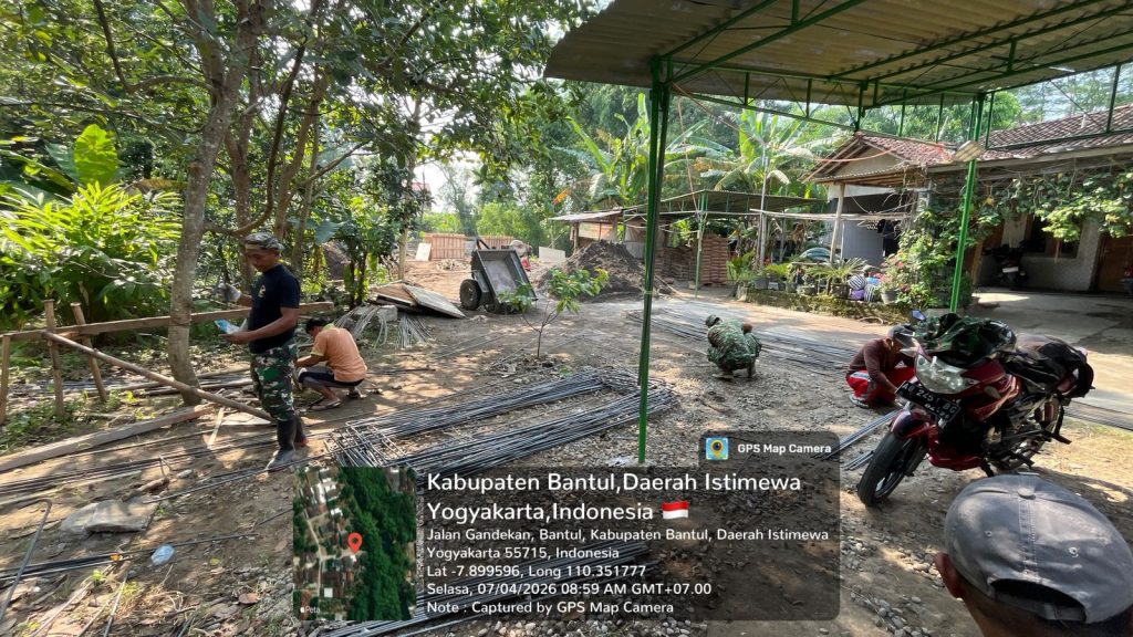 Bantul – Babinsa Kalurahan Trirenggo melaksanakan pemantauan kegiatan pembangunan Jembatan Garuda di Dusun Manding, Trirenggo, Kegiatan hari ini difokuskan pada melanjutkan perakitan kolom besi sebagai persiapan pengecoran pada bagian timur jembatan. Selasa, (6/4/2026).