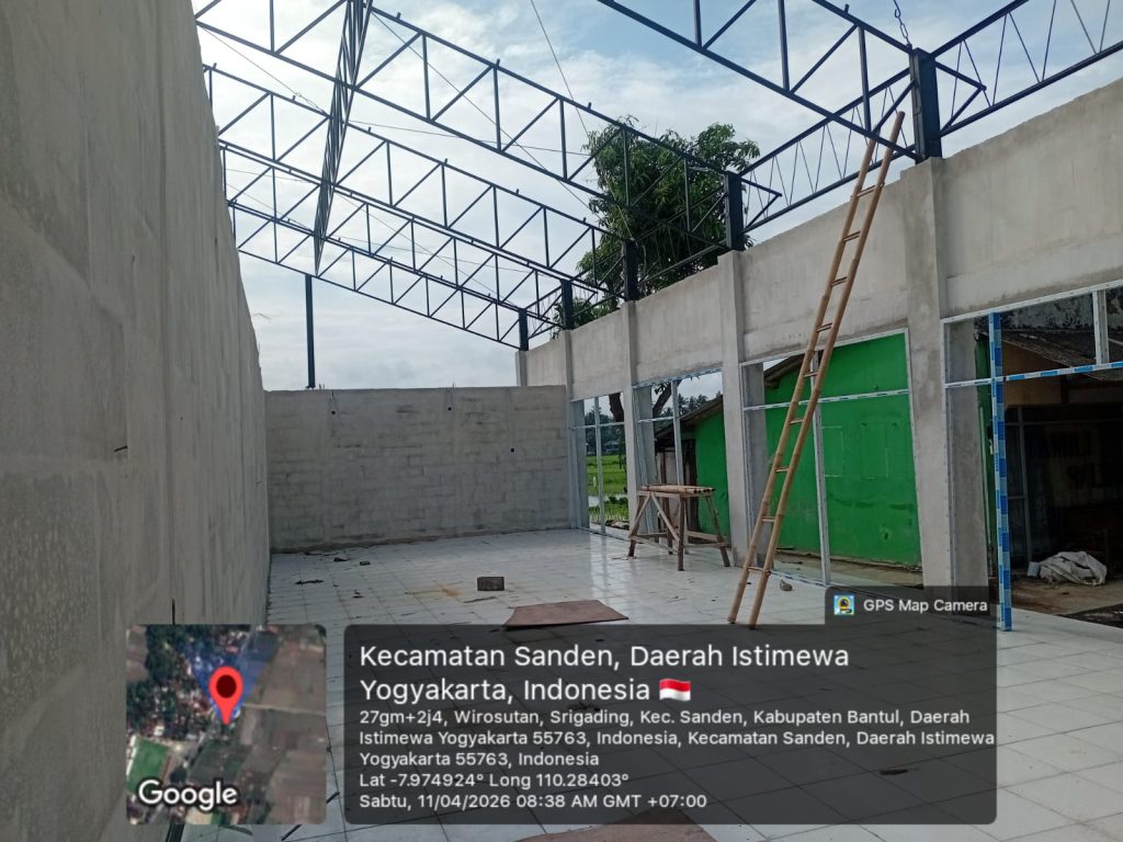 Bantul – Pembangunan KDKMP di Kalurahan Srigading, Kapanewon Sanden, Kabupaten Bantul yang berlokasi di Jalan Samas Km 22 terus menunjukkan perkembangan. kegiatan difokuskan pada pemasangan rangka baja serta penyiapan besi gording sebagai bagian dari struktur utama bangunan. Sabtu, (11/4/2026).