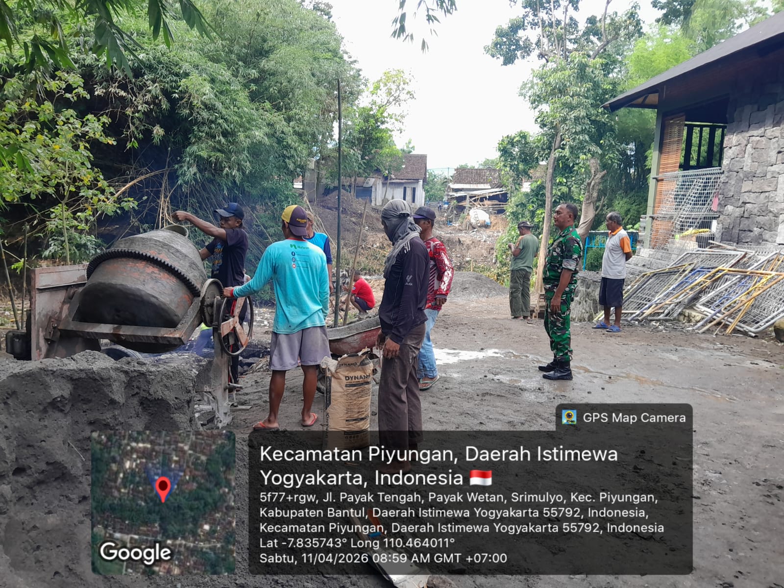 Bantul – Pembangunan Jembatan Garuda di Dusun Payak Tengah RT 03, Kalurahan Srimulyo, Kapanewon Piyungan, Bantul terus berjalan dengan pendampingan dari Babinsa setempat. Babinsa Kalurahan Srimulyo Pelda Sumardi bersama Serma Gunadi turut hadir di lokasi guna mendukung kelancaran proses pembangunan yang sedang berlangsung. Sabtu, (11/4 2026).