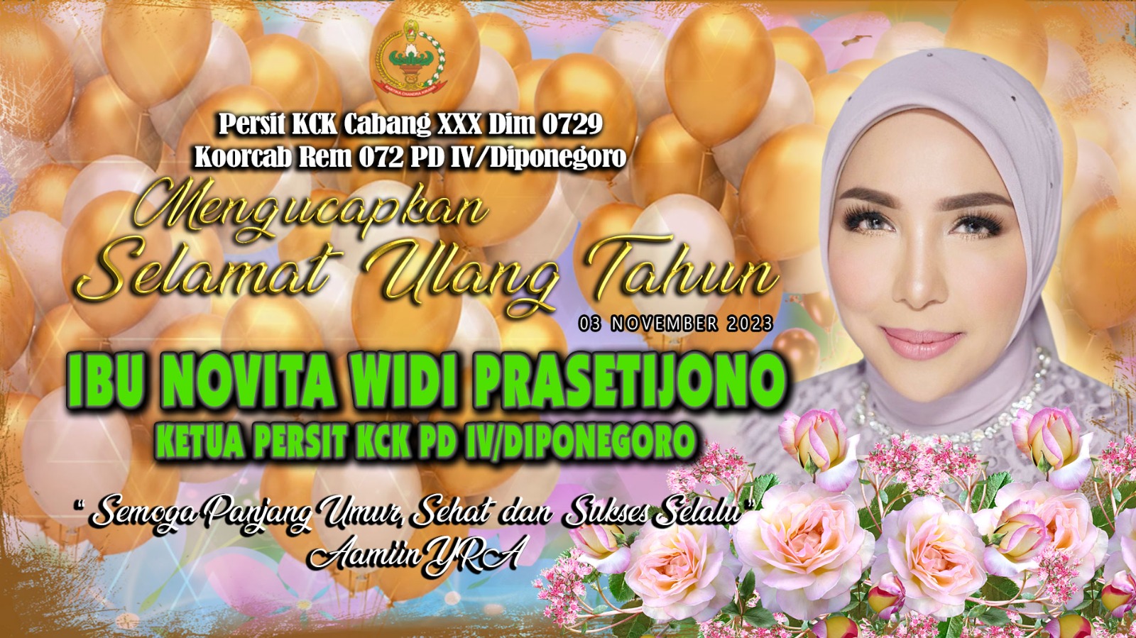 Beranda / Selamat Ulang Tahun Ibu Novita Widi Prasetijono Ketua Persit KCK PD IV/DiponegoroSelamat Ulang Tahun Ibu Novita Widi Prasetijono Ketua Persit KCK PD IV/DiponegoroNovember 2, 2023 Share this ArticlePrevious ArticleDandim 0729/Bantul Ikuti Kegiatan Gerakan Nasional Ketahanan Pangan NasionalNext ArticleBakti Sosial Dalam Rangka Hari Ibu Tahun 2023 di Panti Asuhan Bina Siwi Pajangan Bantuladmin