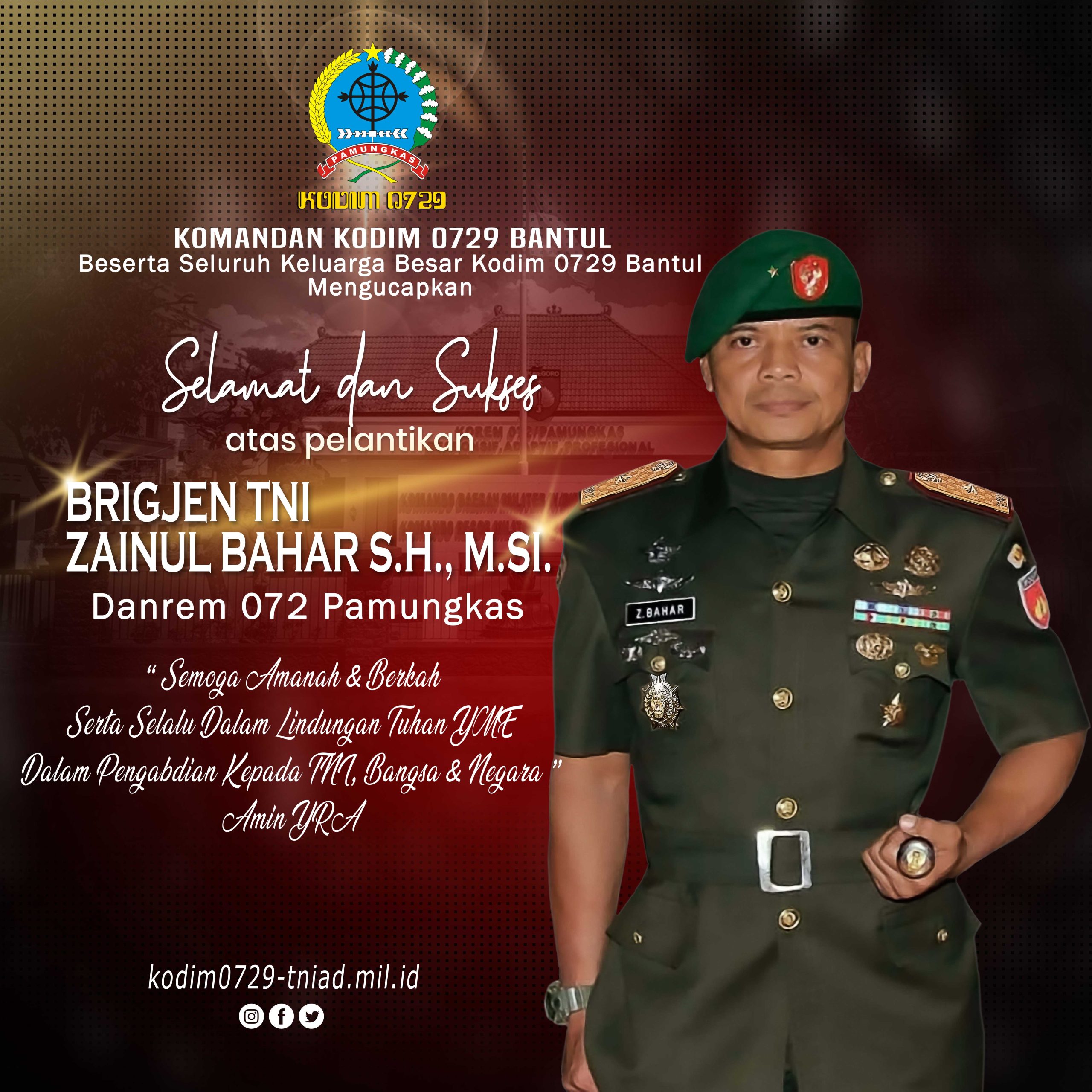 Beranda / Selamat Dan Sukses Atas Pelantikan Brigjen TNI Zainul Bahar, S.H., M.S.SI. Danrem 072 PamungkasSelamat Dan Sukses Atas Pelantikan Brigjen TNI Zainul Bahar, S.H., M.S.SI. Danrem 072 PamungkasNovember 17, 2023 Share this ArticlePrevious ArticleUpacara 17an Bulan November 2023 Kodim 0729/Bantul, Kasad Ingatkan Prajurit Untuk Menjaga Netralitas di Tahun PolitikNext ArticleTNI Masuk Sekolah Berikan Penyuluhan Kenakalan Remaja Dan Pendidikan Karakteradmin