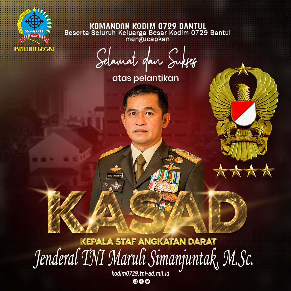Beranda / Selamat dan Sukses Atas Pelantikan KASAD Jenderal TNI Maruli Simanjuntak, M.Sc.Selamat dan Sukses Atas Pelantikan KASAD Jenderal TNI Maruli Simanjuntak, M.Sc.November 29, 2023 Share this ArticlePrevious ArticleDandim Bantul Hadiri Peringatan HUT Korpri Ke 52 Tahun 2023Next ArticleHari AIDS Sedunia ” Let Community Lead ! “admin