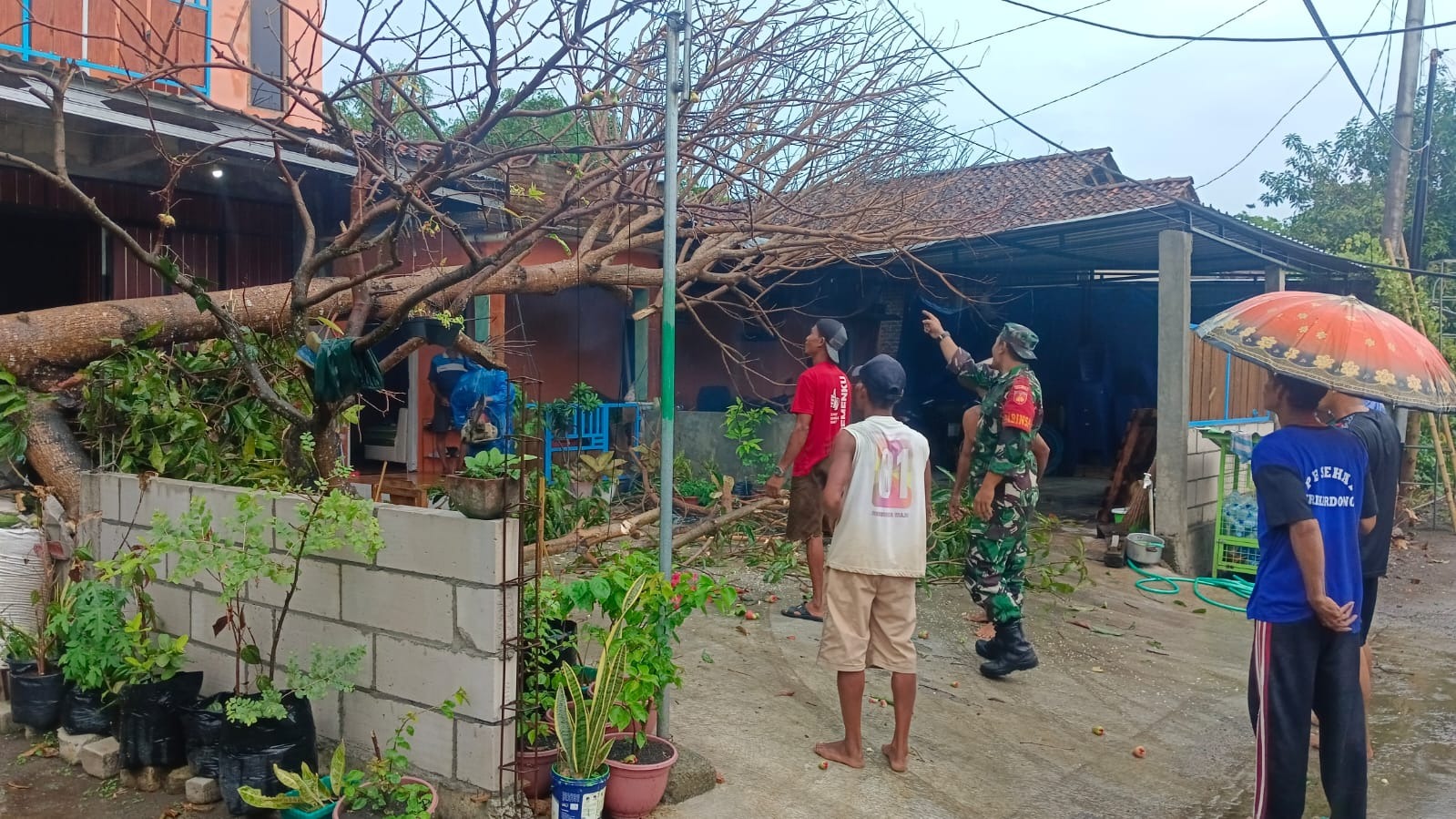 Paska hujan yang disertai angin tersebut reda, Serka Dwiyanto Babinsa Panjangrejo dari Koramil 12/Pundong, Kodim 0729/Bantul melaksanakan pemantauan di wilayah binaannya.