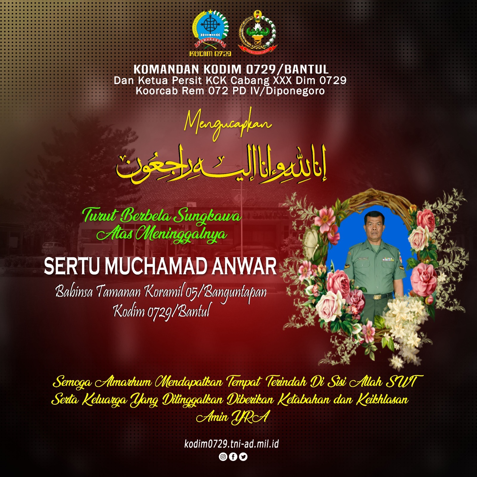 Beranda / Turut Berbela Sungkawa Atas Meninggalnya Sertu Muchamad Anwar Babinsa Tamanan Koramil 05/BanguntapanTurut Berbela Sungkawa Atas Meninggalnya Sertu Muchamad Anwar Babinsa Tamanan Koramil 05/BanguntapanJanuari 15, 2024 Share this ArticlePrevious ArticleDanrem 072 Pamungkas Kunker di Kodim 0729 BantulNext ArticleDandim 0729 Bantul Pimpin Upacara Pemakaman Militer Alm. Sertu Muhammad Anwaradmin
