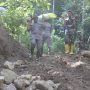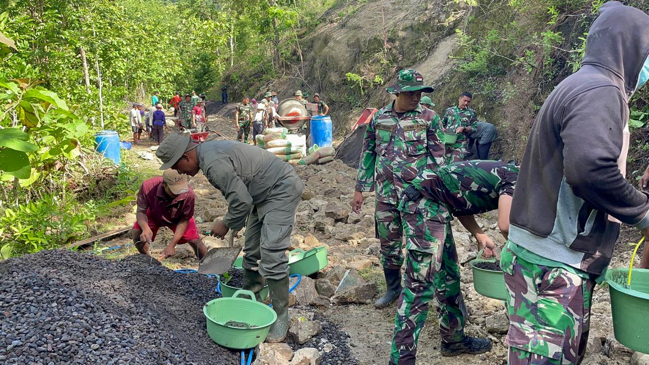 Bantul – Saling mendukung dalam proses pengerjaan pengecoran semenisasi Jalan personel Satgas TMMD Reguler Ke – 119 Tahun 2024 Kodim 0729 Bantul bersama warga tampak kompak saling bergotong-royong menyiapkan campuran adukan kerikil, semen dan pasir dengan bantuan sarana mesin molen kecil. (Rabu 21/02)