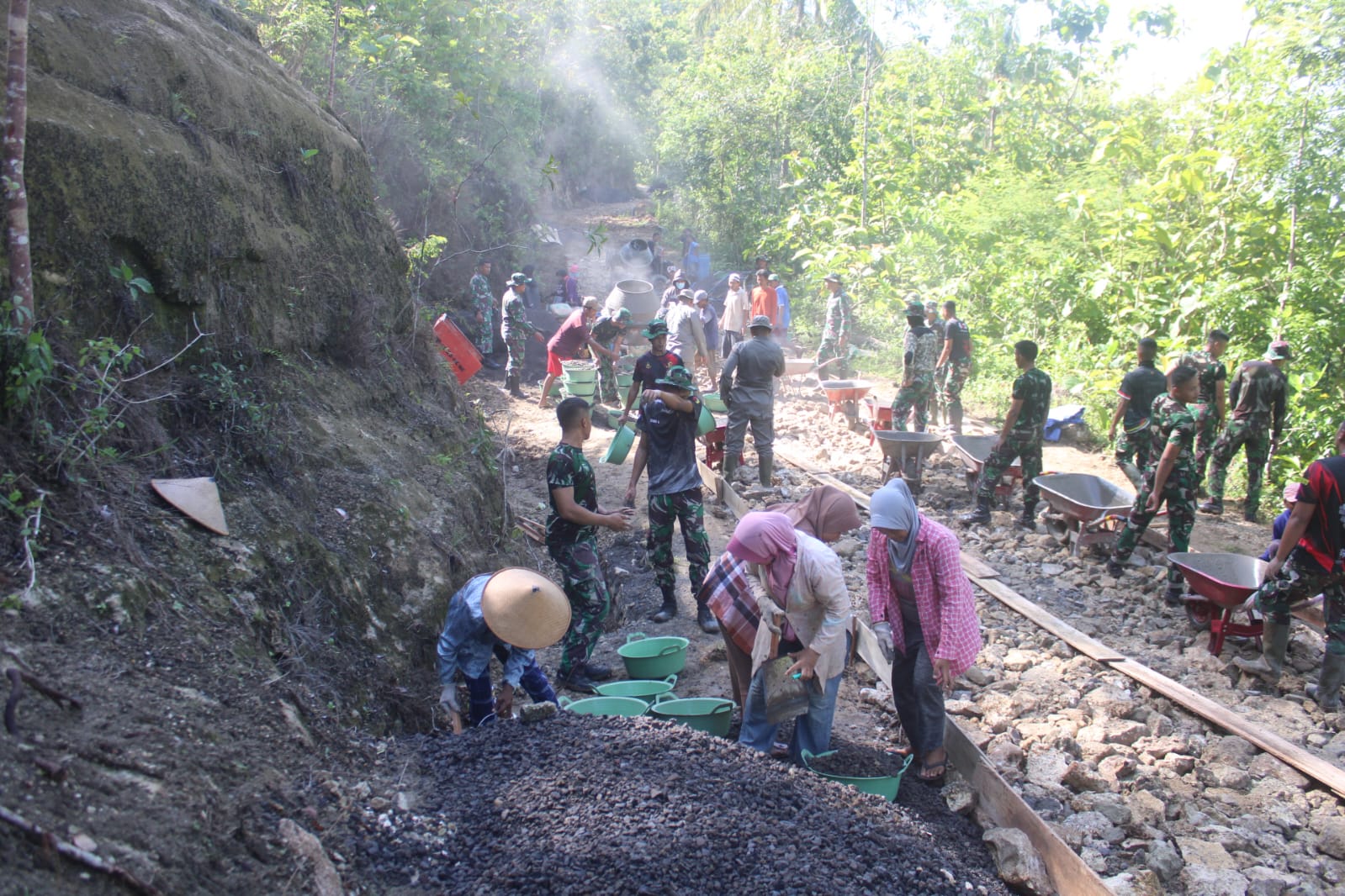 Bantul – Pada hari kedua kegiatan Tentara Manunggal Membangun Desa (TMMD) Reguler Ke – 119 Tahun 2024 Kodim 0729 Bantul, di Dusun Tangkil, Kal. Muntuk & Dusun Salam, Kalurahan Temuwuh, Kapanewon Dlingo, Kabupaten Bantul, dilakukan pengerjaan fisik oleh personil TNI dengan gotong royong bersama masyarakat membangun jalan.