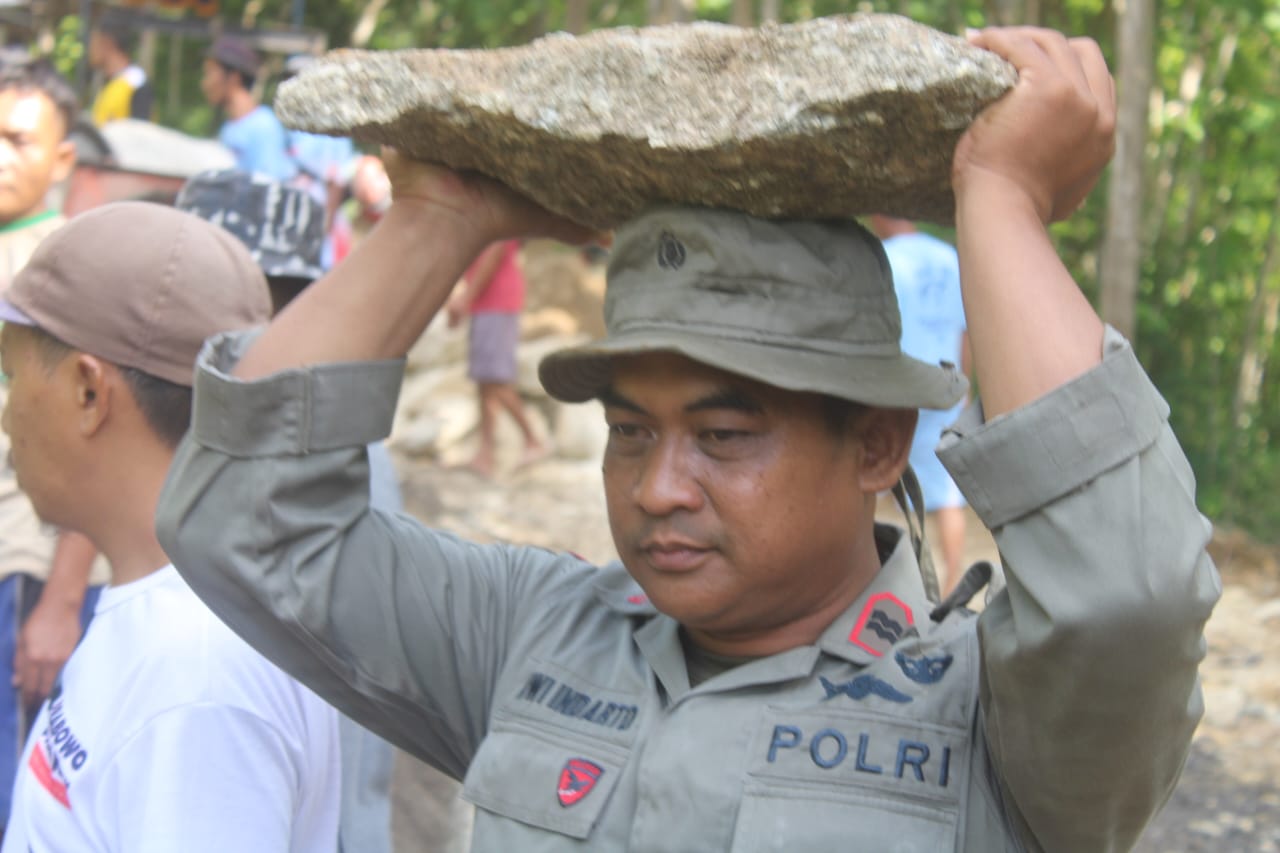 Hal itulah yang dilakukan Anggota Satgas TMMD Reg 119 Kodim 0729 Bantul dari personel Brimob Polda DIY, dengan memindahklan material batu secara manual yakni memikul bongkahan demi bongkahan menuju lokasi pembangunan yang jarak tempuh dari tempat material ke lokasi pembangunan lumayan jauh.