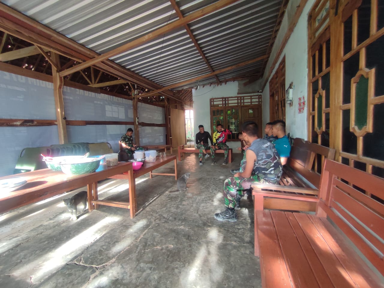 Bantul – Di sela waktu istirahat untuk sholat dan makan, anggota Satgas TMMD 119 Kodim 0729 Bantul memilih menikmati gorengan dan kopi panas di rumah salah seorang warga yang berada di Dusun Tangkil, Kal. Muntuk, Kalurahan Temuwuh, Kapanewon Dlingo, Kabupaten Bantul
