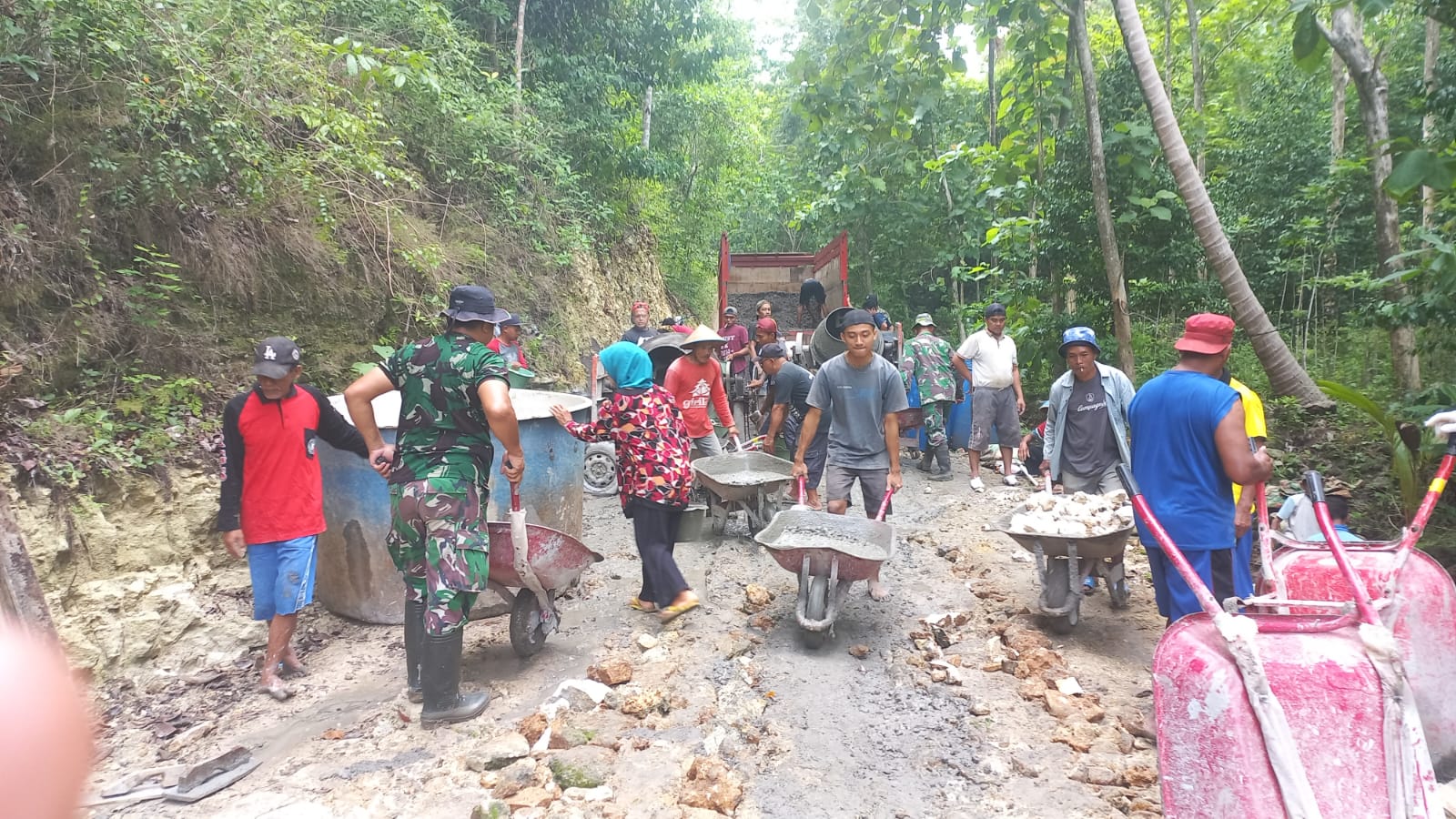 Bantul – Secara bergotong-royong, Anggota Satgas TMMD Reguler 119 Kodim 0729 Bantul bersama warga masyarakat kebut pembangunan corblok jalan yang ada di Dusun Tangkil, Kal. Muntuk & Dusun Salam, Kalurahan Temuwuh, Kapanewon Dlingo, Kabupaten Bantul.