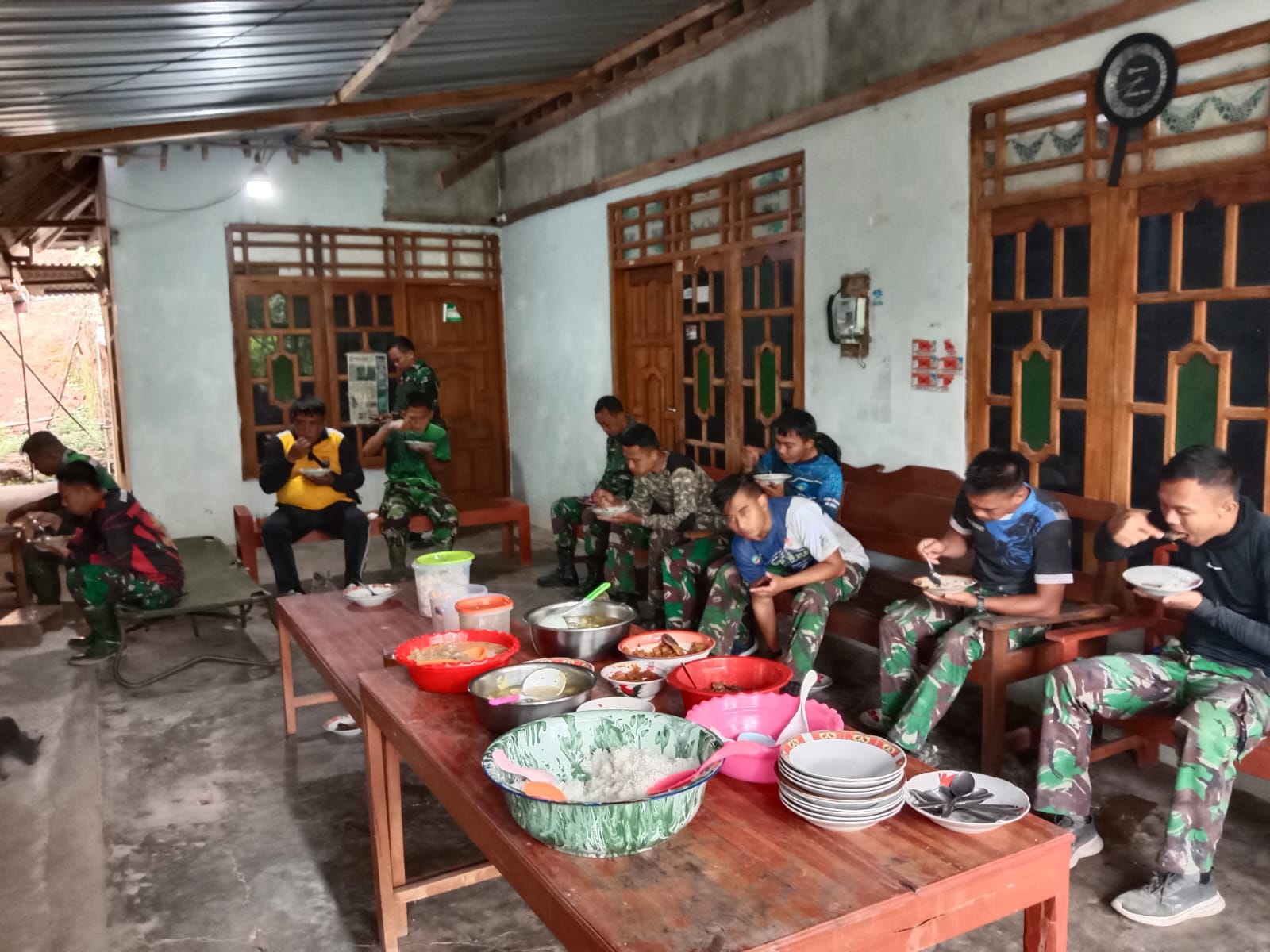 Mbah Poniran (49 tahun) pemilik rumah mengatakan, “Kami memang bermaksud untuk bersedekah makan sarapan pagi kepada para Anggota Satgas TMMD yang bekerja di sekitar rumah kami yang sekarang sedang mengerjakan pembangunan di Dusun Tangkil dan Salam, Katanya.
