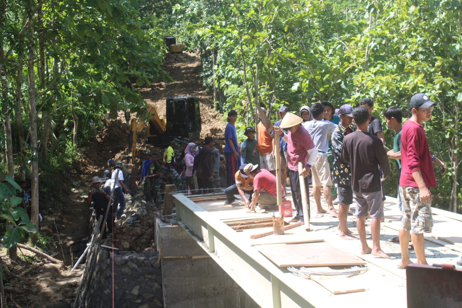 Bantul – Program TMMD Reguler 119 Kodim 0729 Bantul di Dusun Tangkil, Kal. Muntuk & Dusun Salam, Kalurahan Temuwuh, Kapanewon Dlingo, Kabupaten Bantul, salah satunya yaitu membuat jembatan menjadi akses utama penghubung pembukaan jalan sepanjang antar desa. Memasuki minggu ketiga proses pengerjaan jembatan sudah memasuki tahap pembuatan pondasi sekitar 55 persen.