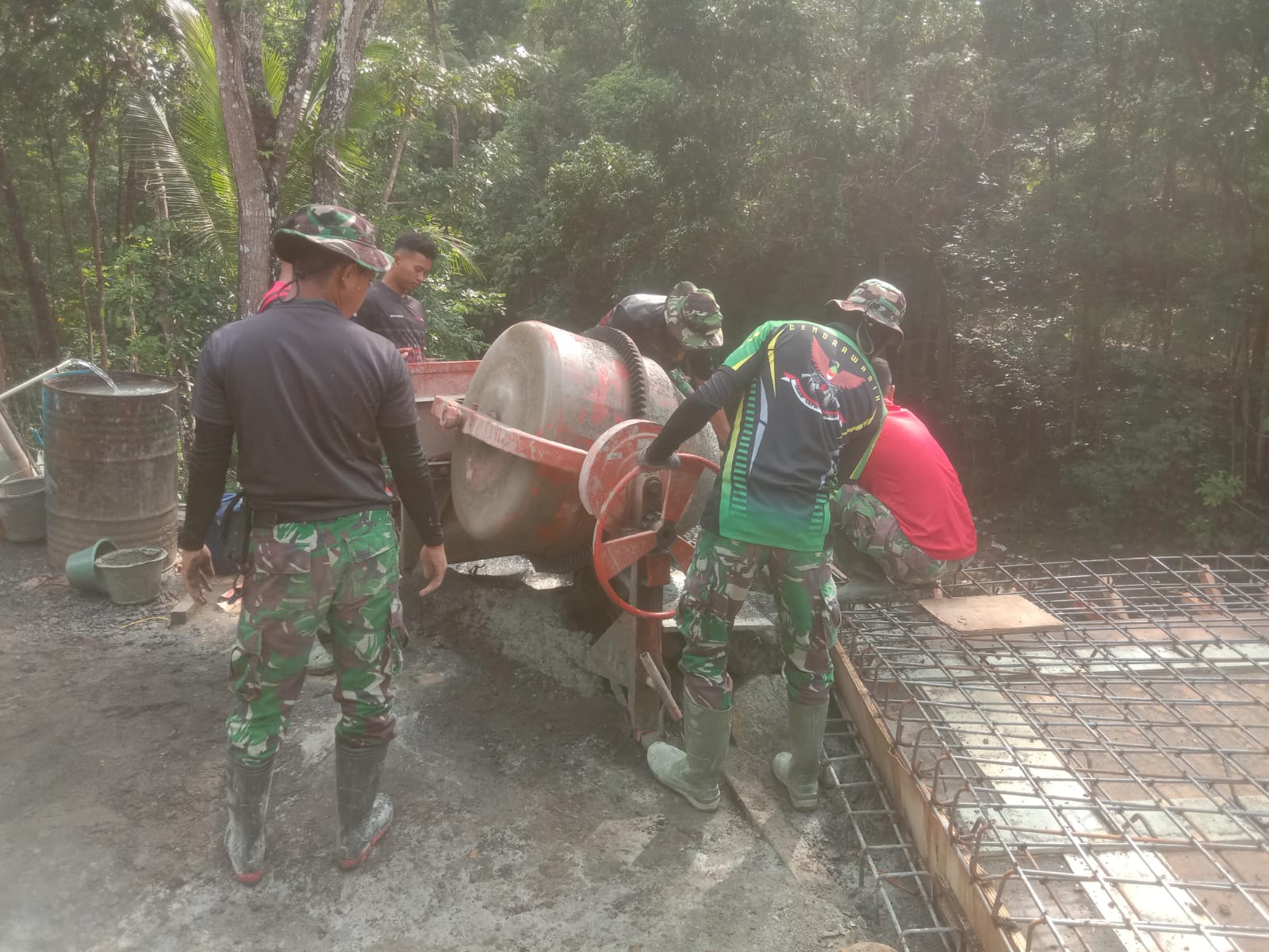 Dijelaskan Dan SSK Letda Inf Bayu Setiawan selaku Perwira Kordinator kegiatan, pengerjaan jembatan telah akan menyelesaikan proses pengecoran, yang mana sebelumnya kemarin telah kita siapkan rangka besi serta papan mal dan hari ini kita lanjut ke pengecoran.