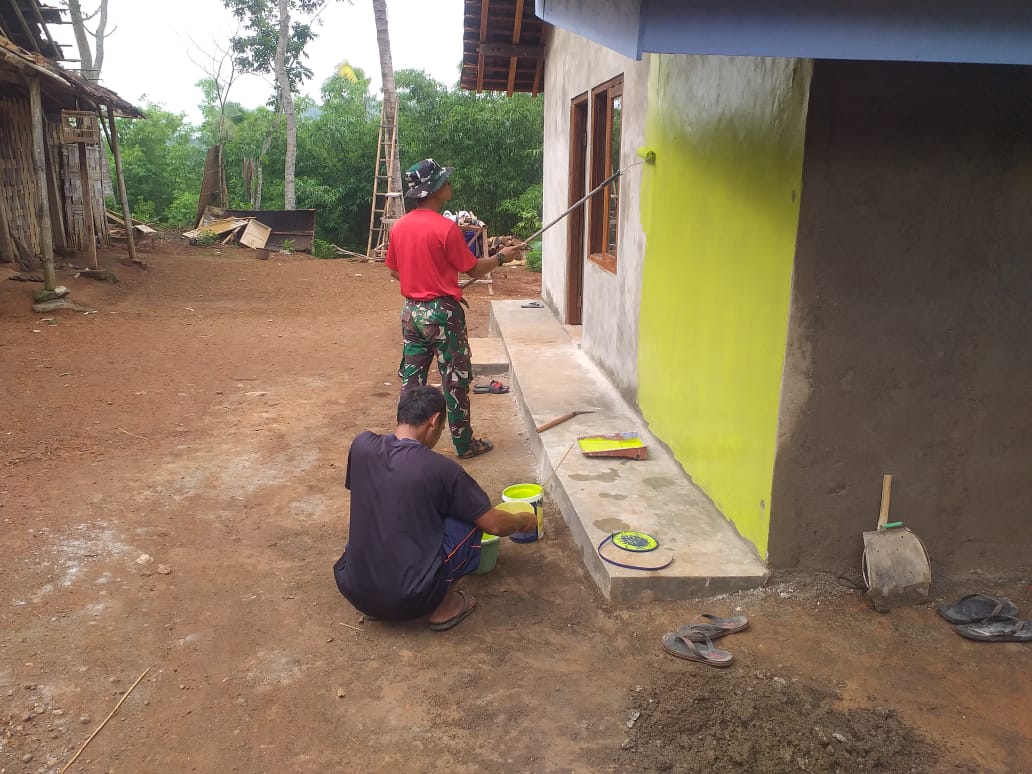 Nampak Sertui Drajayt bersama anggota Satgas lainnya tengah mengerjakan pengecatan dinding rumah bagian luar milik Prahara berwarna hijau muda, yang mana kini bangunannya sudah selesai, tinggal menyisakan pengerjaan pengecatan dinding dan finishing pembersihan sekitar rumah yang terus dilakukan oleh Satgas TMMD dan dibantu warga setempat. “Pokoknya menjelang penutupan yang dihadapi sebagian besar anggota Satgas adalah cat, mengecat dan mengecat RTLH,” ucap Sertu Drajat.