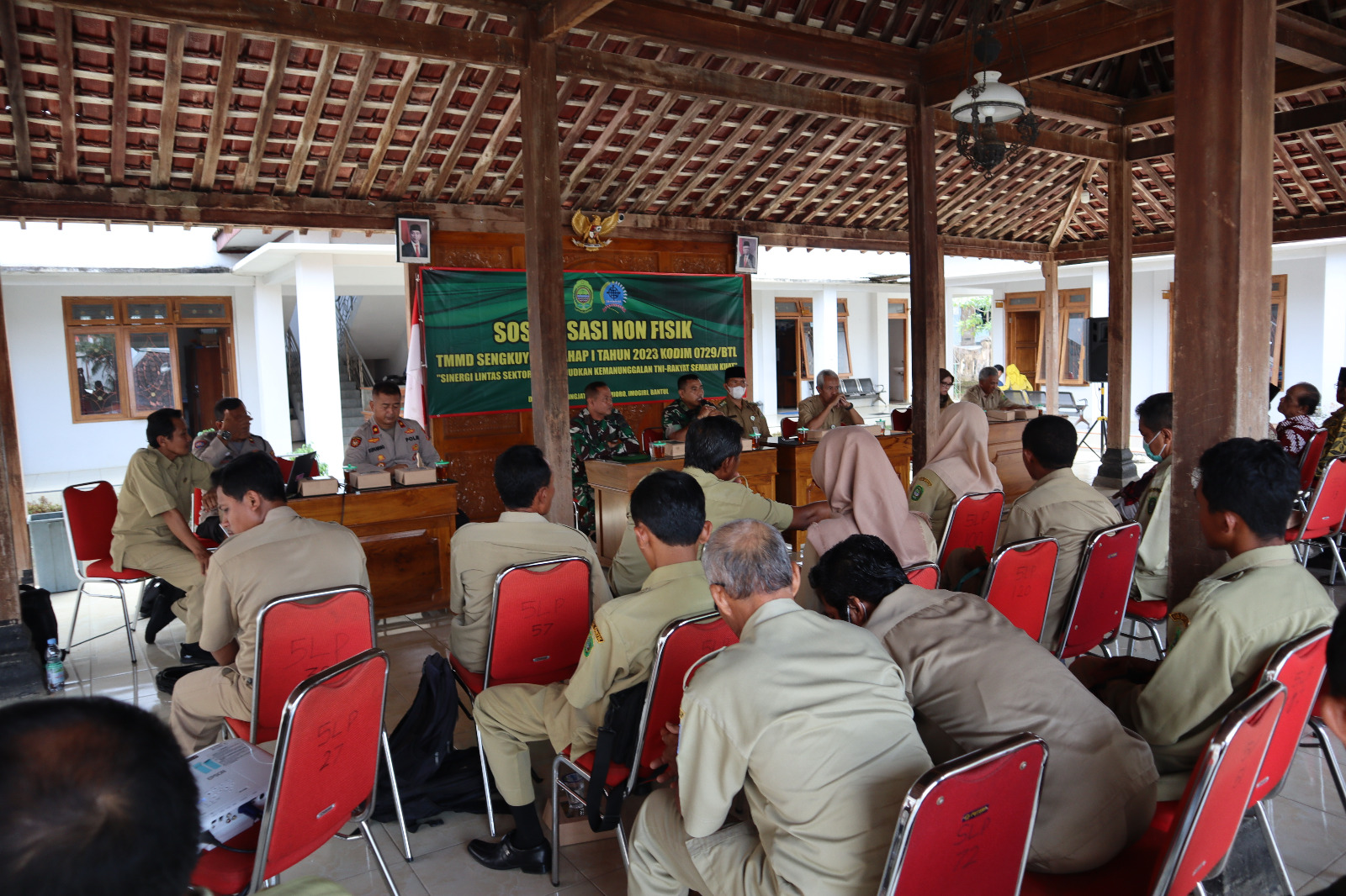 Guna memberikan pemahaman tentang kegiatan TMMD kepada warga masyarakat, Kodim 0729/Bantul bersama dengan Dinas PMKal Kab. Bantul melaksanakan sosialisasi di Balai Kalurahan Selopamioro, Imogiri, Bantul pada Senin (8/5/23).