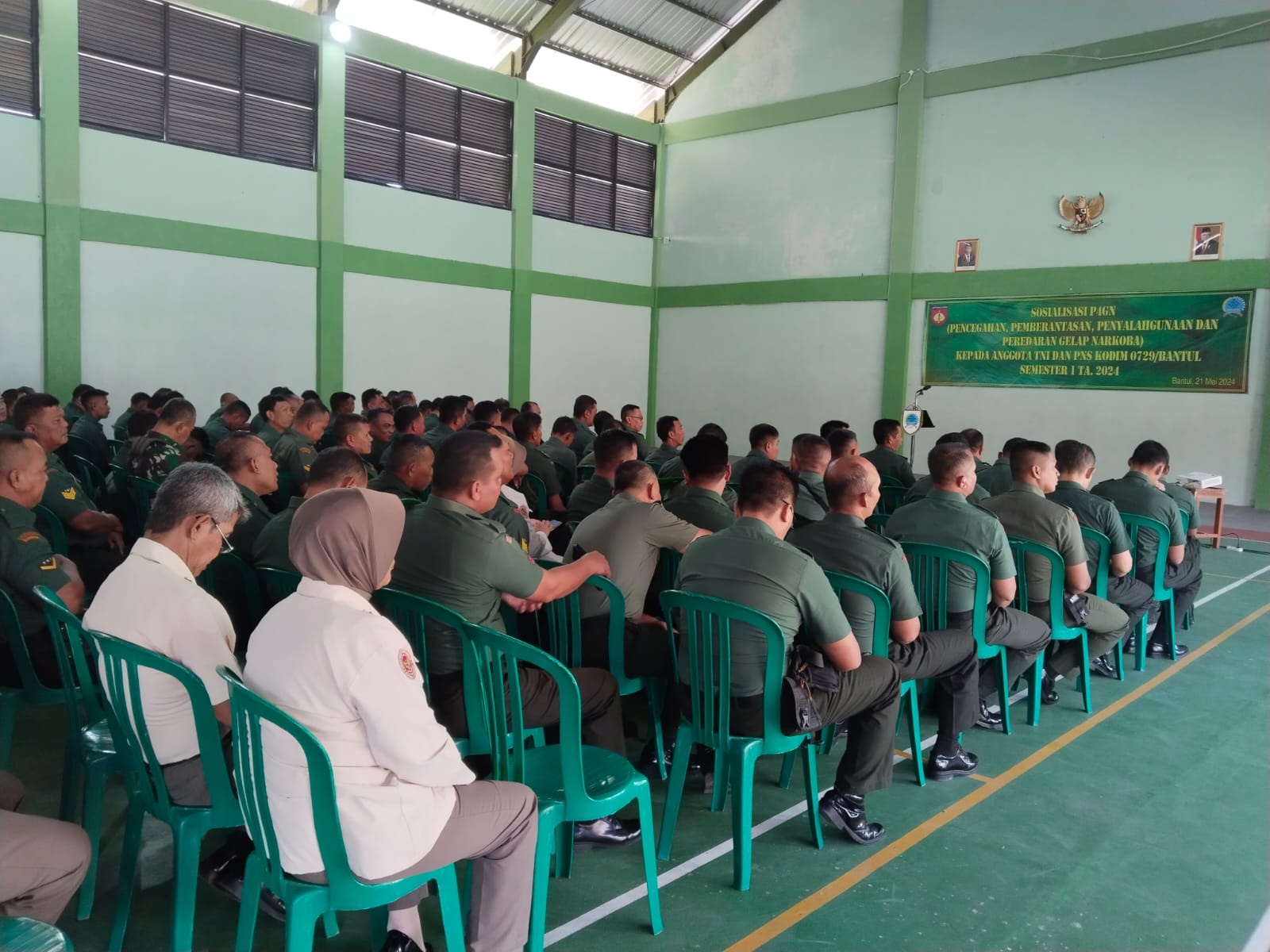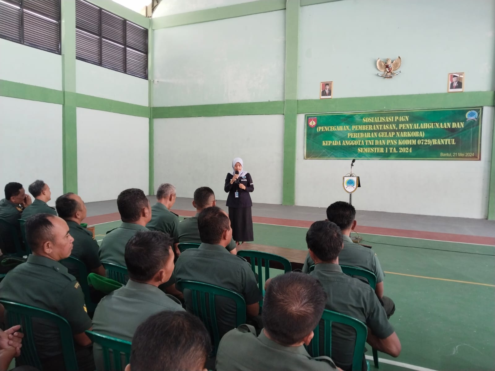 P4GN di laksanakan bekerja sama dengan Puskesmas Kota Kabupaten Bantul yang diawali dengan pemeriksaan urine bagi Prajurit dan PNS TNI Kodim 0729 Bantul, dilanjutkan Sosialisasi P4GN, bertempat di GOR Darmawangsa Makodim 0729 Bantul, Jln. A Yani No 1 Melikan Kidul Bantul, Badegan, Bantul, Kab. Bantul, Senin, 21/05/2024.
