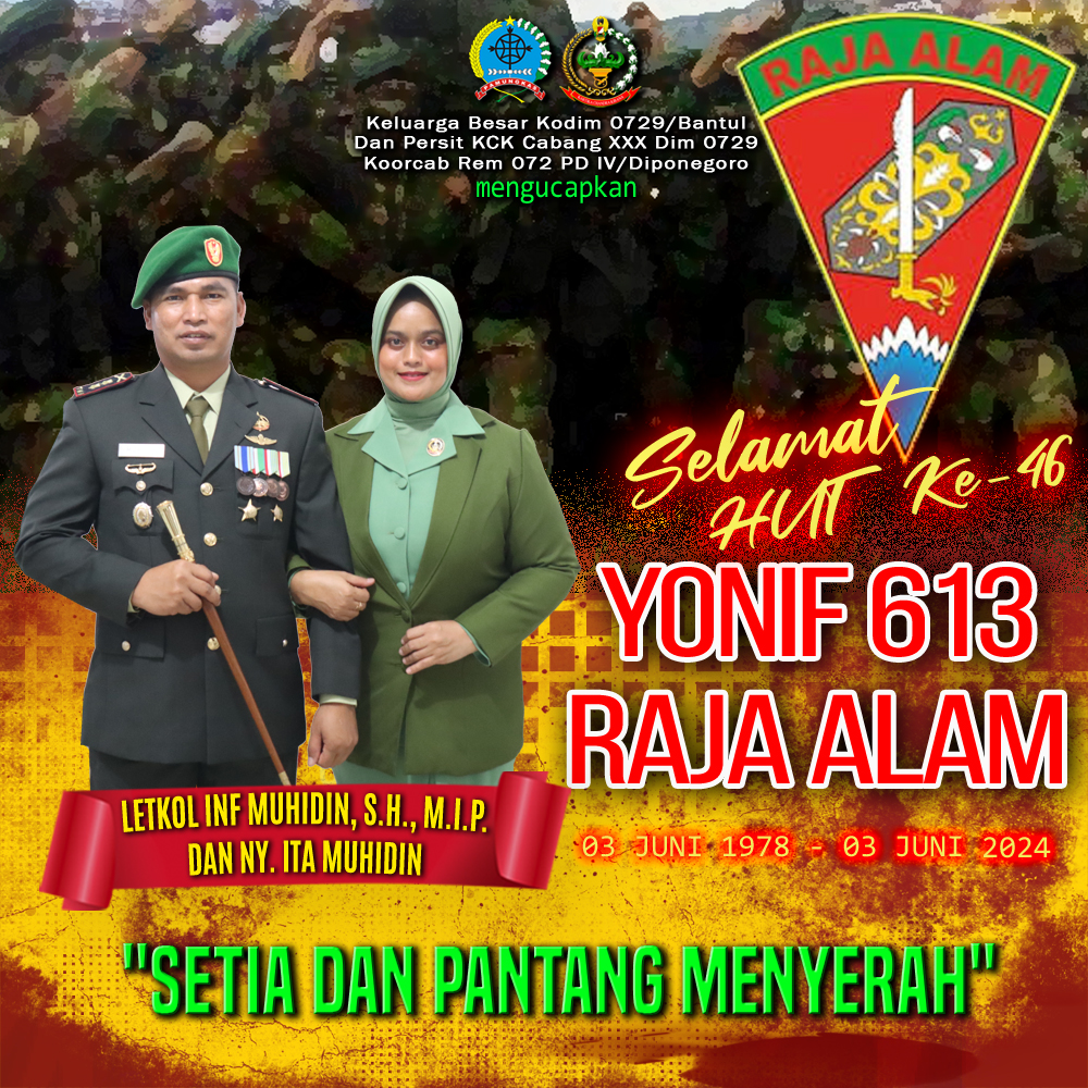 Beranda / Selamat HUT Ke – 46 Yonif 613 Raja Alam 03 Juni 1978 – 03 Juni 2024 “SETIA DAN PANTANG MENYERAH”Selamat HUT Ke – 46 Yonif 613 Raja Alam 03 Juni 1978 – 03 Juni 2024 “SETIA DAN PANTANG MENYERAH”Juni 2, 2024Share this ArticlePrevious ArticleKodim 0729/Bantul Ikuti Rapat Koordinasi Program PAT Secara VirtualNext ArticleDandim 0729 Bantul Dampingi Pangdam IV/DIP Kunjungi Museum Memorial Jenderal Besar Soehartoadmin