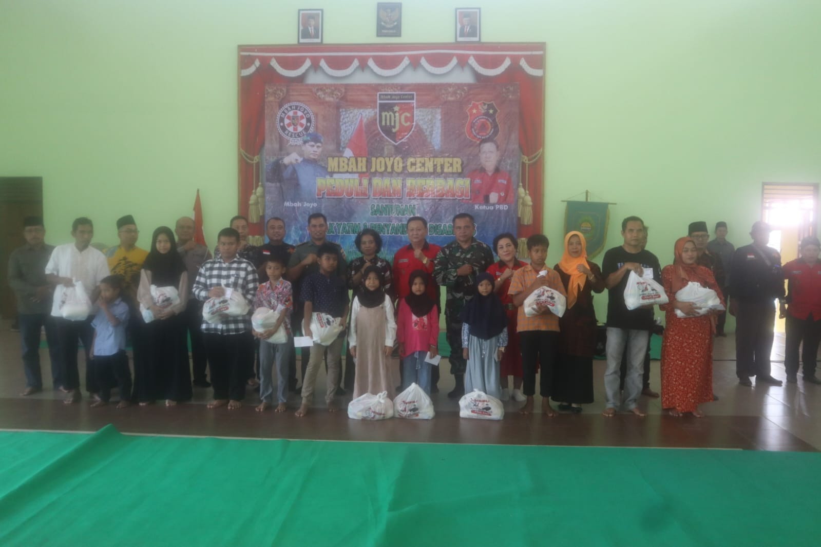 Kegiatan penyerahan santunan kepada anak anak yatim dan penyandang disabilitas berlangsung aman dan lancar diakhiri dengan foto bersama.