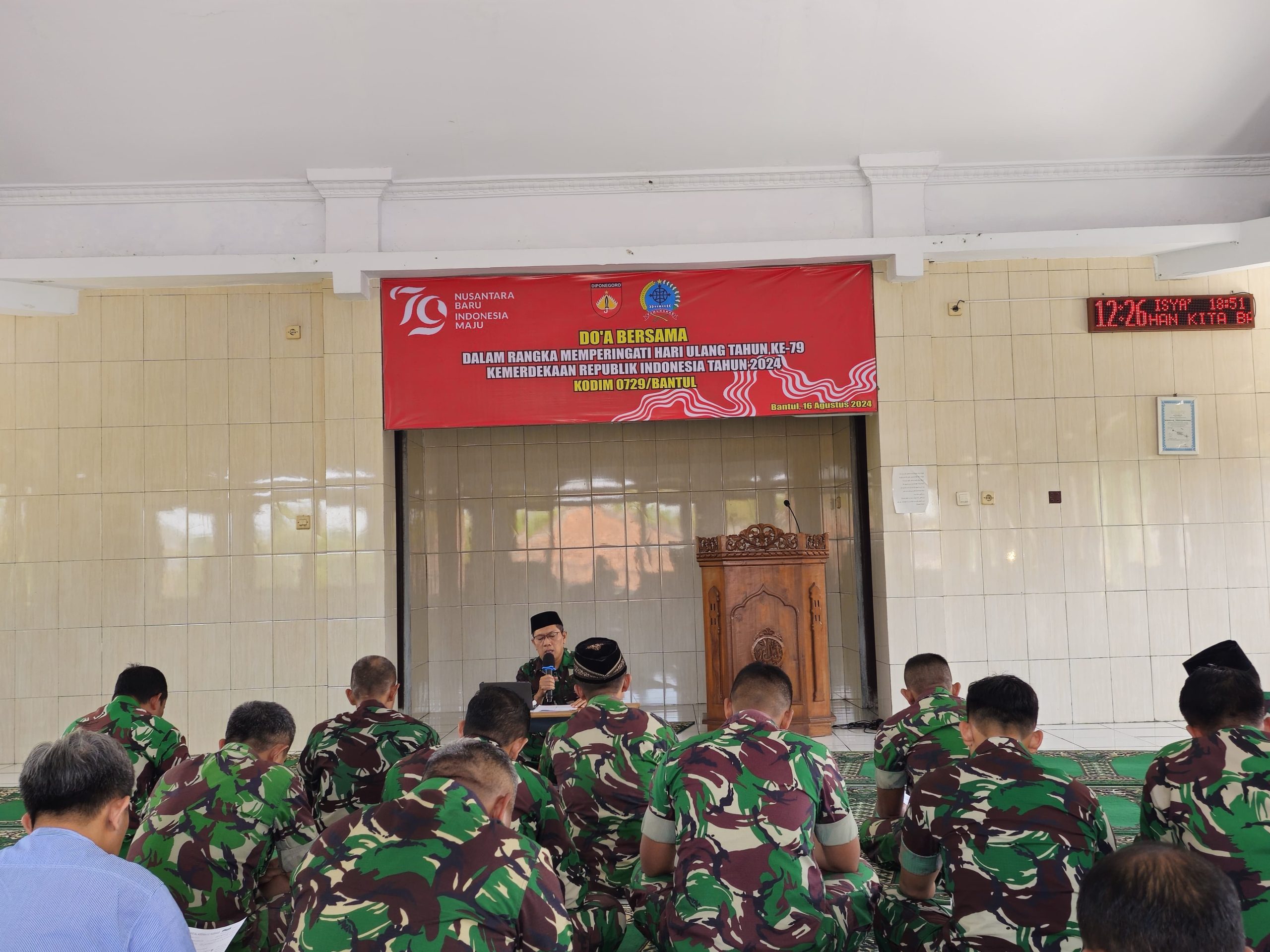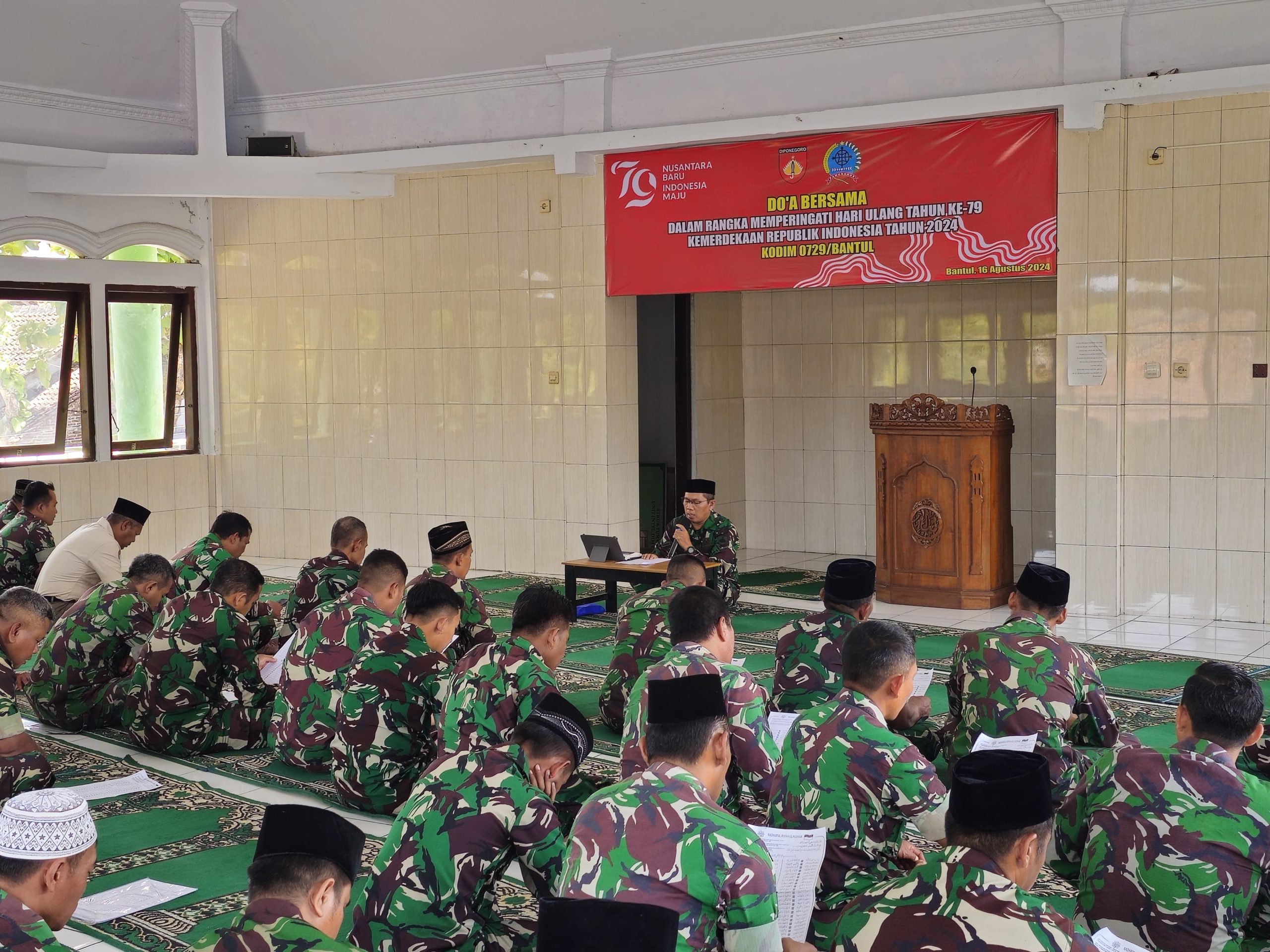 Bantul-Dalam rangka menyambut HUT RI ke-79, serangkaian kegiatan digelar oleh Kodim 0729/Bantul. Salah satunya, adalah doa bersama yang digelar di masjid At Taqwa, Makodim Bantul. Jumat (16/08/2024).