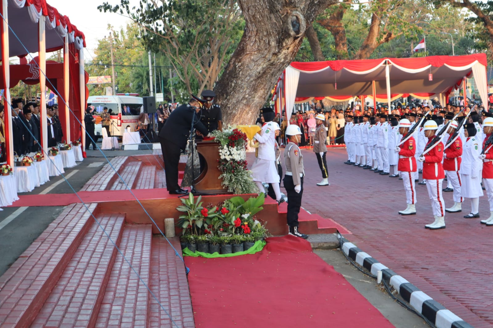 BANTUL – Bertempat di lapangan Trirenggo depan Rumah Dinas Bupati Bantul, Komandan Kodim 0729/Bantul Letkol Inf Muhidin, S.H., M.I.P. ikuti Upacara penurunan bendera dalam rangka HUT RI ke-79 tahun 2024 yang di pimpin oleh Kapolres Bantul AKBP Michael R. Risakota selaku Inspektur Upacara d/a Trirenggo, Kec. Bantul, Kabupaten Bantul, Daerah Istimewa Yogyakarta. Sabtu, (17/8/2024) sore.