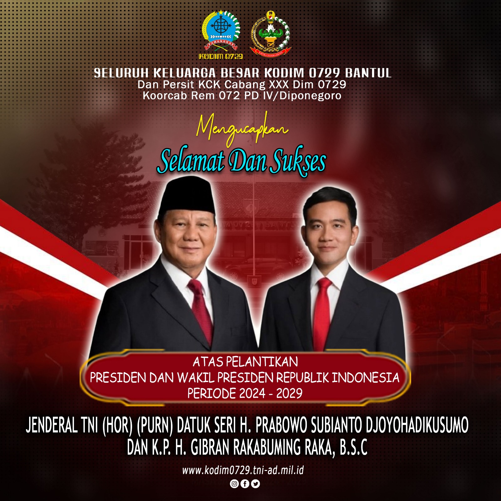 Beranda / Selamat Dan Sukses Atas Pelantikan Presiden Dan Wakil Presiden Republik Indonesia Periode 2024 – 2029Selamat Dan Sukses Atas Pelantikan Presiden Dan Wakil Presiden Republik Indonesia Periode 2024 – 2029Oktober 20, 2024Share this ArticlePrevious ArticleDandim Bantul Resmi Tutup Turnamen Kejuaraan Pencak Silat Dandim Cup Ta. 2024Next ArticleKodim 0729/Bantul Diserbu Ratusan Anak TKadmin