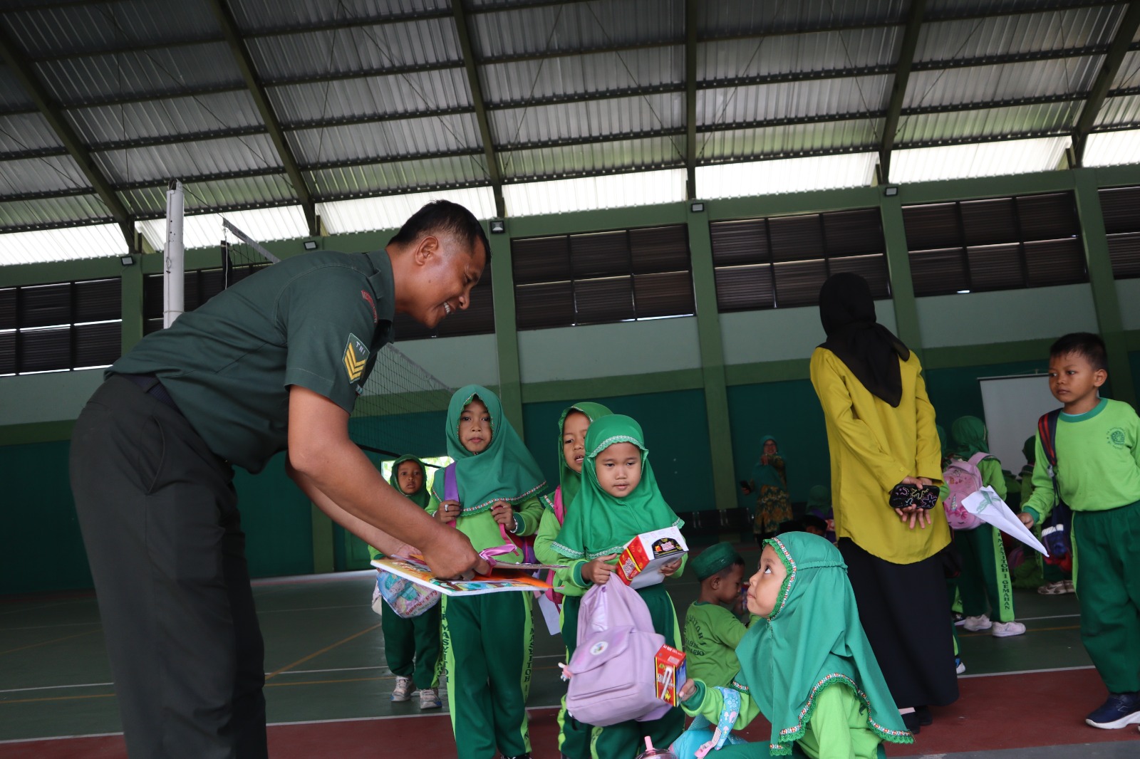 Anak anak TK dikenalkan dengan macam macam corp, pakaian dan perlengkapan serta senjata yang digunakan dari masing masing kesatuan yang ada di TNI AD.