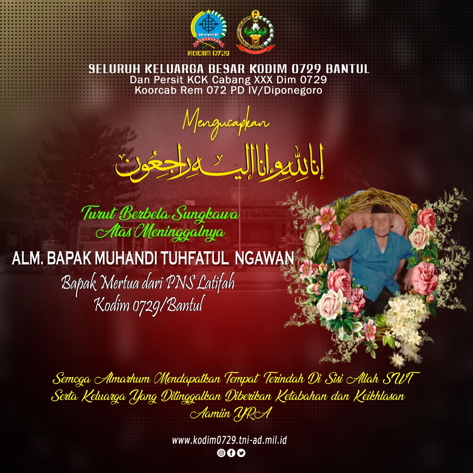 Turut Berbela Sungkawa Atas Meninggalnya Alm. Bapak Muhandi Tuhfatul Ngawan Bapak Mertua PNS Latifah Kodim 0729/Bantul “Semoga Almarhum Mendapatkan Tempat Terindah Di Sisi Allah SWT Serta Keluarga Yang DItinggalkan DIberikan Ketabahan Dan Keikhasan Aamiin YRA “