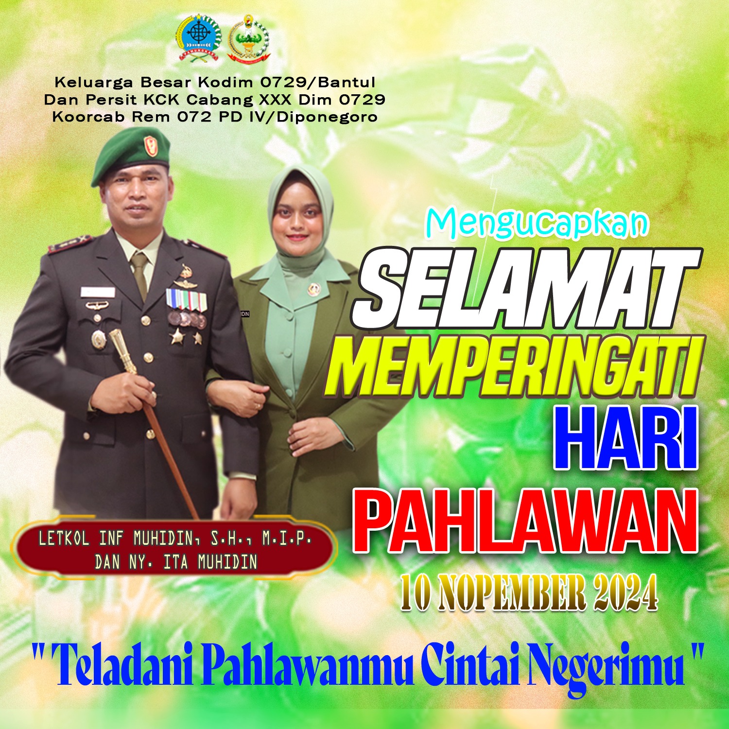 Beranda / Selamat Memperingati Hari PahlawanSelamat Memperingati Hari PahlawanNovember 9, 2024Share this ArticlePrevious ArticleSelamat Ulang Tahun Letkol Inf Muhidin, S.H., M.I.P. Semoga Panjang Umur Dan Sukses Selalu Aamiin YRANext ArticleKodim 0729/Bantul Gelar Upacara dan Ziarah Nasional Peringati Hari Pahlawan ke-79admin