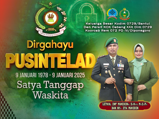 Beranda / Dirgahayu Pusintelad “Satya Tanggap Waskita”Dirgahayu Pusintelad “Satya Tanggap Waskita”Januari 9, 2025Share this ArticlePrevious ArticleDandim 0729/Bantul Letkol Inf Muhidin Apresiasi Babinsa yang Gotong Royong Bersihkan Sisa Kebakaran Ponpes Al-AnwarNext ArticleDandim 0729/Bantul letkol Inf Muhidin SH MIP silaturrahmi kunjungi Pondok Pesantren An-Nur Ngrukem Pada hari Jumat, 10 Januari 2025, pukul 10.00-11.10 WIB, di Pondok Pesantren An-Nur Ngrukem, Kelurahan Pendowoharjo, Kapanewon Sewon.admin