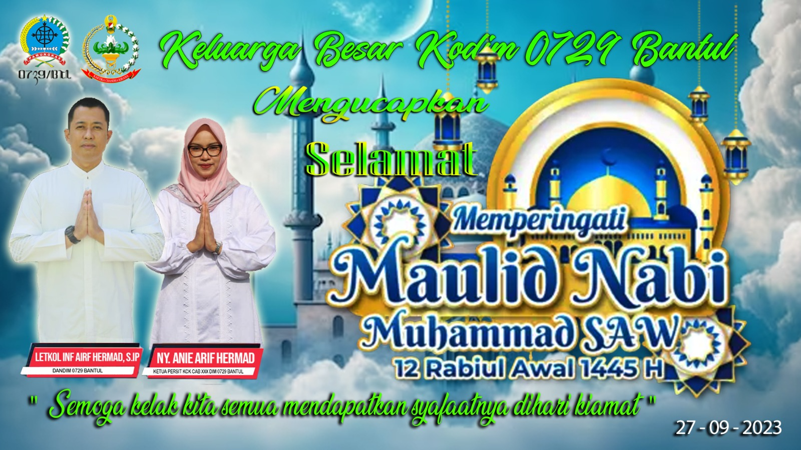 Beranda / Selamat Memperingati Maulid Nabi Muhammad SAW 12 Rabiul Awal 1445 HSelamat Memperingati Maulid Nabi Muhammad SAW 12 Rabiul Awal 1445 HSeptember 27, 2023 Share this ArticlePrevious ArticleKodim 0729 Bantul TMMK dan Peringatan Hari Kontrasepsi SeduniaNext ArticleZiarah Rombongan Makan Pahlawan Panglima Besar Jenderal Soedirman Dalam Rangka HUT KE-78 TNIadmin