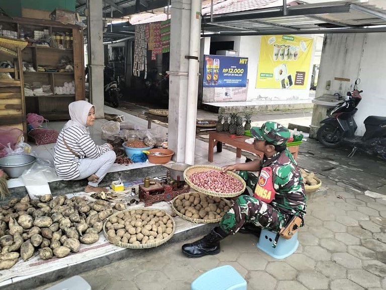 Pandak_Babinsa Koramil 16/Pandak Kodim 0729/Bantul Koptu Ari Usman F melaksanakan pengecekan ketersediaan dan harga sembako secara langsung di pasar Gumulan ( tradisional ) Kalurahan Caturharjo, Kapan...